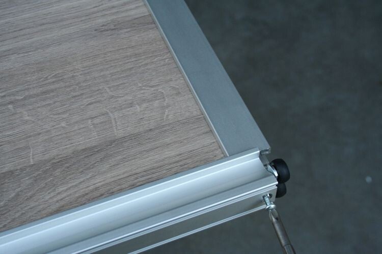 Aluminium systeem met gelagerde boven en onderwielen.